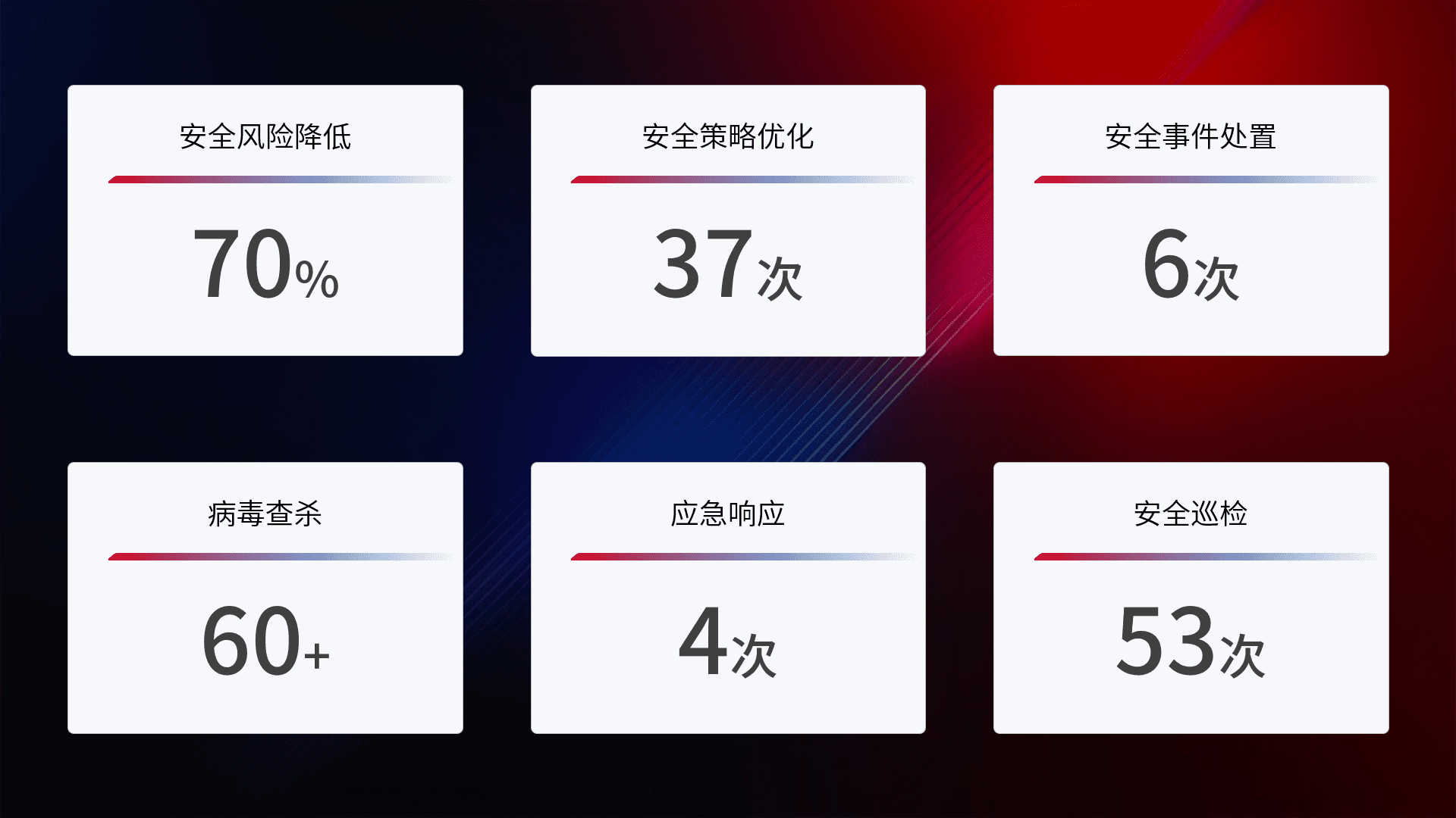 提供全面的安全事件报告体系,,,,包括处置报告、、、周报、、、季度和年度总结,,结合持续监控,,帮助客户深入了解网络安全状况。。。。