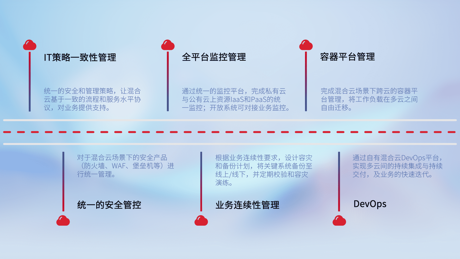 通过多云纳管,,以统一的资源数据模型把客户的云资源进行抽象和封装,,,进而实现对多云资源的统一操作,,,,保障云资源管理的可靠性、、稳定性与可用性。。。。量身定制化运维内容,,配置、、开发运维、、、、补丁管理、、、、备份、、监控、、、、认证和访问管理、、审计和日常巡检等,,,,保障在用云过程中的可靠度,,,稳定度以及高可用率。。